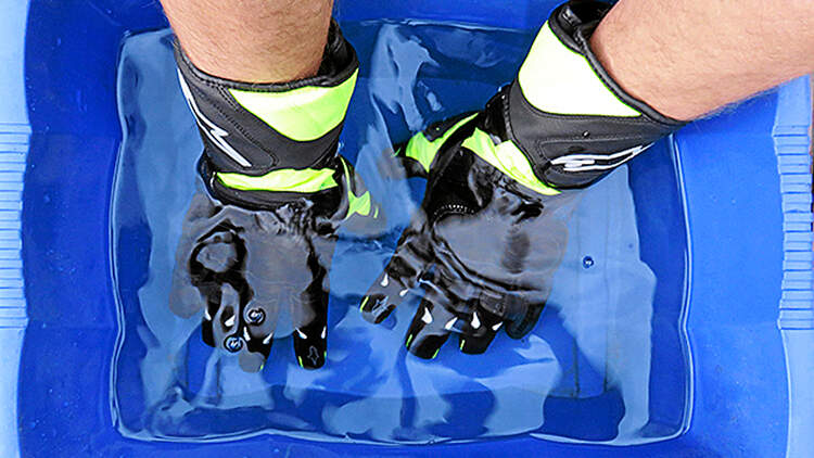 Nach der trockenen Praxis wurde es dann zurück am Redaktionsstammsitz in Stuttgart wieder feucht. Nicht dass hier der Regen auf Bestellung vom Himmel fällt. Für vergleichbare Testaussagen müssen natürlich einheitliche Bedingungen herrschen, und die lassen sich kaum durch eine Testfahrt bei Regen finden. Wie bei den Stiefeln (siehe MOTORRAD 9/2015) wird hier einmal das Tauchbad und einmal der Fülltest angewandt, um etwaige Undichtigkeiten bei jeweils zwei Motorradhandschuhpaaren aufzuspüren. Da in beiden Fällen der Wasserein- bzw. -austritt in kürzester Zeit erfolgte, scheint es sich im Regelfall weniger um ein konstruktives denn viel mehr um ein qualitatives Problem zu handeln. Wenn zum Beispiel die Nähte der Klimamembran nicht sauber abgetapt wurden. Ohnehin ist der Tauchtest ein probates Mittel für jedermann, um gleich nach dem Kauf die wasserdichte Eigenschaft zu überprüfen und dies nicht erst auf der Urlaubstour feststellen zu müssen.