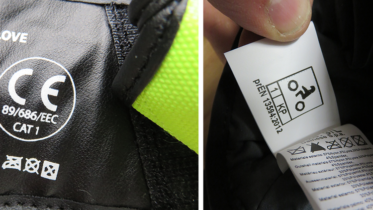 Ein Handschuh, der nach Kategorie 1 der 89/686/EEC (Foto links) gekennzeichnet ist, erfüllt lediglich die Schutzfunktion, die man zum Beispiel bei leichten Gartenarbeiten erwarten kann. Motorradhandschuhe nach der (vorläufigen) Norm prEN 13594:2012 sind dagegen mit einem eindeutigen Piktogramm gekennzeichnet (Foto rechts). Weiterhin gibt der Einnäher Aufschluss darüber, ob die Handschuhe Schutzlevel 1 oder die schärfere Stufe 2 erfüllen und die Fingerknöchel geschützt sind (Zusatz KP).