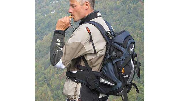 Mit seiner integrierten, drei Liter fassenden Trinkblase eignet sich der Glacier-Rucksack der Marke Source bestens für schweißtreibende Motorrad-Abenteuer. Die komplette Isolierung von Trinkblase und -schlauch, der durch den Schultergurt verläuft, hält Flüssigkeiten entweder bei eisigen Außentemperaturen warm oder bei Wüstenklima kühl. Die vielen unterschiedlich großen Fächer bieten laut Hersteller rund 25 Liter Stauraum. Für ausgedehnte Tagestouren erwies sich das in der Praxis als absolut ausreichend. Außerdem zeichnen den Rucksack ein hervorragendes Trageverhalten mit toller Fixierung dank einstellbarer Träger, Brust- und Bauchgurt sowie die gute Verarbeitung mit robusten Reißverschlüssen aus. Ungewöhnlich: Das große Staufach liegt dem Rücken zugewandt und ist nur bei abgesetztem Rucksack zugänglich. Und obwohl sich der Glacier bei kurzzeitigen Regenfahrten als wasserdicht erwies, wäre eine Regenhülle wünschenswert.
