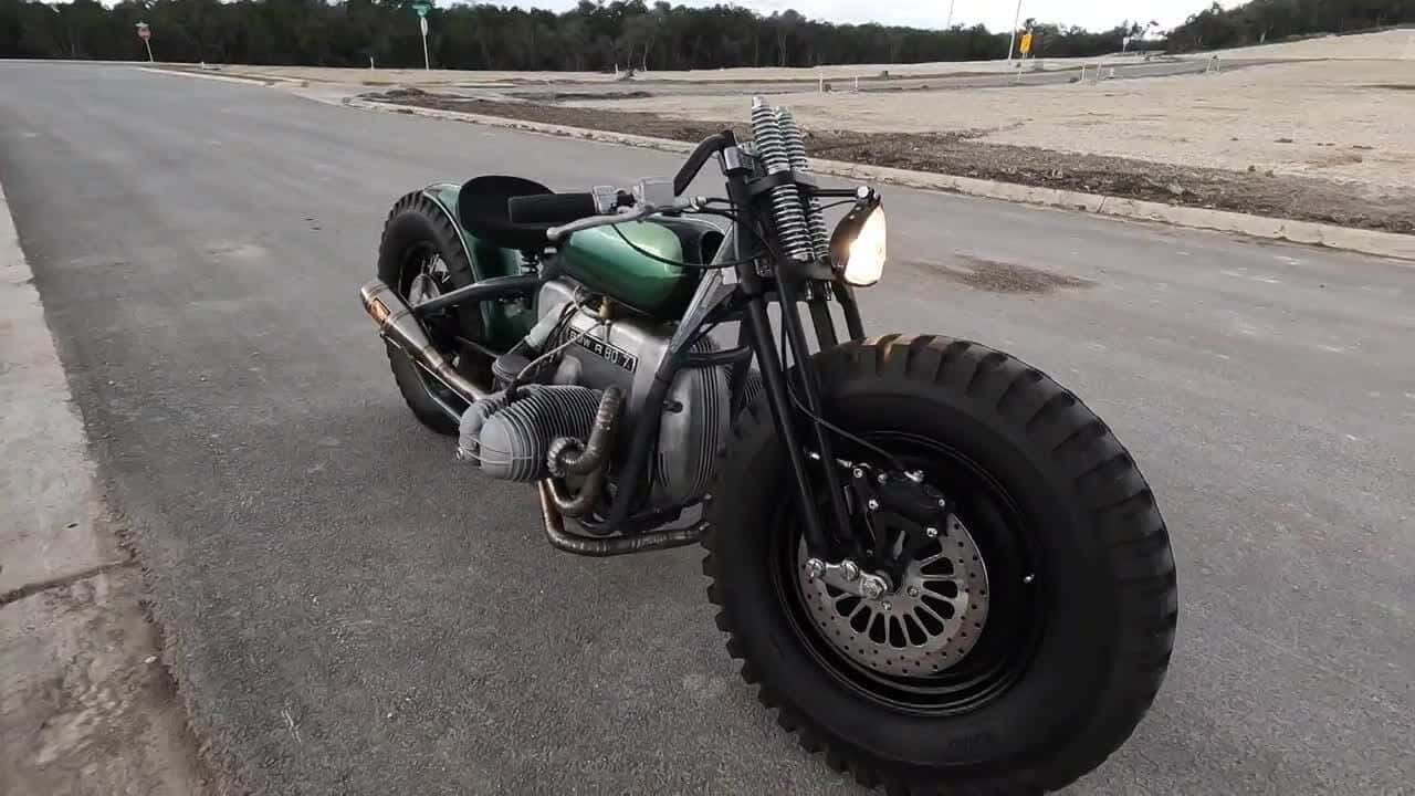 Auffälligste Merkmale dieses Boxer-Bobbers sind die Traktor-Reifen, vorn und hinten im Format 6.00-16. Vom Reifenhersteller Firestone sind sie sogar für militärische Einsätze freigegeben, umso martialischer sehen sie am Motorrad aus. An der Front baute Johnny ein schwarzes Scheibenrad von Harley-Davidson ein. Fürs Heck wurde eine strapazierfähige Aluminium-Felge von Excel eingespeicht, ganz knapp passend zur originalen Radnabe samt Hinterachsgetriebe und Kardanwelle. Ebenfalls übernommen wurde die originale Trommelbremse hinten, am Vorderrad adaptierte Johnny eine Scheibenbremse.