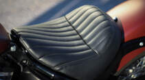 Stets mit dem 107er-V2 bestückt, geht die Harley-Davidson Softail Street Bob supersanft ans Gas. Das passt. Der Schub auch. 2.000 Touren, und der Tag ist dein Freund. In den unteren Gängen reichen auch gut und gerne 1.500/min. Das Gefühl von Kraft fährt durchaus mit auf dem Sechs-Zentner-Eisen. Etwas trockener als bei den bisherigen Softails spricht das Federbein an, zudem fehlt dem Street Bob-Federbein der praktische Drehknauf à la Fat Bob und Breakout. Über billige Baumarktschrauben im Sichtbereich und den ab Werk zu hoch montierten Schalthebel tröstet der für Harley-Verhältnisse günstige Einstiegspreis ab 15.000 Euro hinweg: Dies ist der erschwinglichste Big Twin!