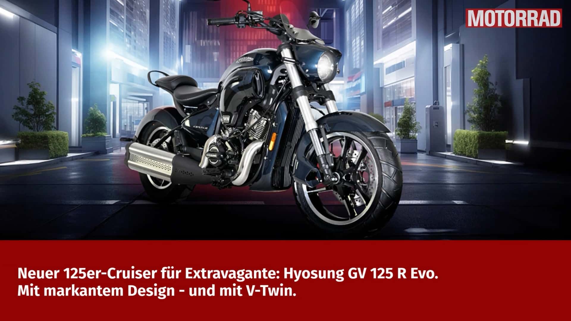 Als Antrieb kommt bei der GV 125 R Evo ebenfalls der bewährte, wassergekühlte V-Twin zum Einsatz. Mit 60 Grad Zylinderspreizung sowie jeweils einer obenliegenden Nockenwelle und 3 Ventilen pro Zylinder (2 am Einlass, 1 am Auslass). Jeweils 42 Millimeter Bohrung und 45 Millimeter Hub ergeben genau 124,7 Kubik. Als Spitzenleistung nennt Hyosung 13,3 PS (9,9 kW) bei cruiser-untypisch quirligen 10.250/min. Damit reizt Hyosung das europäische Leichtkraftrad-Limit – 15 PS (11 kW) – nicht ganz aus.
