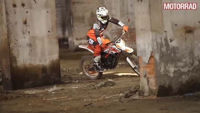 Passend dazu die für ein Motorrad eher kleine und dünne Bremsscheibe mit 210 Millimeter Durchmesser, mit einer 4-Kolben-Postmount-Bremse. Ebenfalls MTB-Komponenten. Die Aluschwinge in Cantilever-Bauweise ist mit einem voll einstellbaren Federbein mit Umlenkung und 240 Millimeter Radweg verbunden. Vorn als MTB, hinten Motocross. Die Reifen von Kenda haben die Dimensionen 70/100-19 vorn und 90/100-18.