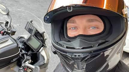 Hendrik Stütz – fast 2 Meter groß – mit der Ducati Multistrada V4 S.