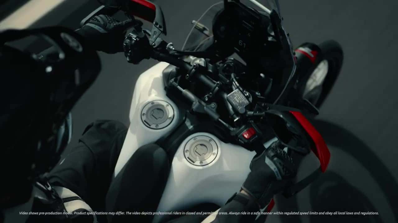 Weitere auffällige Änderungen an der Yamaha Ténéré 700 World Raid liegen direkt im Sichtbereich des Fahrers: der neue, in 16 Stufen einstellbare Lenkungsdämpfer sowie der zweiteilige Aluminium-Benzintank – nach wie vor mit 23 Liter Volumen, aber angeblich 1,5 Kilogramm leichter als bisher. Und dazu passend die neue, einteilige "Rallye"-Sitzbank. Entsprechend sportlich fällt die Sitzhöhe aus: 89 Zentimeter.