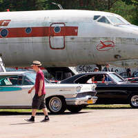 Er meint das Race 61, bei dem er jedes Jahr am Start ist. Ein Sprintrennen über die Achtelmeile, offen für alle Fahrzeuge verschiedener Kategorien bis Baujahr 1961. Vor 16 Jahren aus der Taufe gehoben von den Betreibern des Berliner Rock-’n’-Roll-Clubs Roadrunner’s Paradise. Heute Nachmittag soll das Rennen auf der Rollbahn starten. Wo einst Flugzeuge abhoben und landeten, gibt’s zuerst die Qualifikationen, dann wird Auto gegen Auto, Motorrad gegen Motorrad um Zeiten gekämpft. Deswegen sind die meisten hierher auf das weitläufige Gelände des Luftfahrtmuseums in Finowfurt, rund 50 Kilometer nordöstlich von Berlin, gekommen. Wegen des Rennens und um ein Wochenende im Fifties-Spirit des Roadrunner’s abzufeiern.