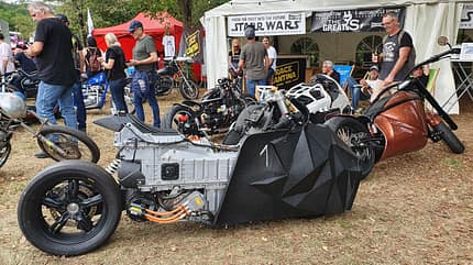 An Verrücktheiten herrschte jetzt wahrlich kein Mangel. Die Schweizer Mofa-Schmiede Siggnature restauriert und tunt erfolgreich die bei den Eidgenossen sehr beliebten Mofas. Gelebte Nostalgie eben. Doch sie können auch Custom-Mofas der Extraklasse. Ein absolutes Highlight am Glemseck war ihr Moped mit einem 7-Zylinder-Sternmotor. Der bringt es mit rund 23 Kubikzentimeterchen pro Zylinder auf gerade mal 160 Kubik und 10 PS bei 6.000 Umdrehungen. 600 Arbeitsstunden waren notwendig, um den Sternmotor – er war für Modellflugzeuge gedacht – als Antrieb für ein Zweirad zu adaptieren. Wahnsinn auf Rädern.