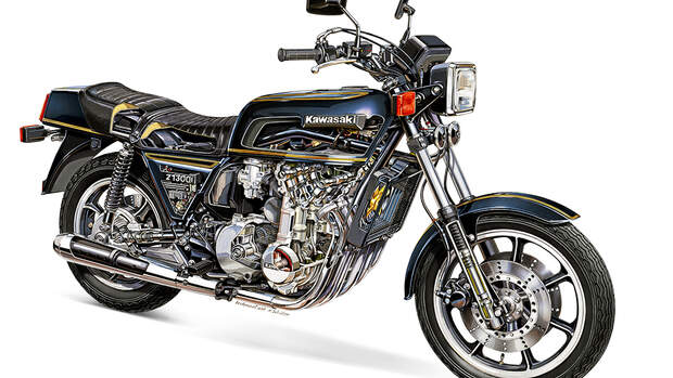 Die Eckdaten der Z 1300 waren 1978 eine Kampfansage: 1286 cm³, 120 PS, über 100 Nm Drehmoment – der wassergekühlte Sechszylinder übertraf alles bisher Dagewesene. Mit satten 120 Kilogramm tat er dies allerdings auch in puncto Gewicht. Der mächtige Motor begnügt sich mit zwei per Tassenstößel gesteuerten Ventilen pro Zylinder, die beiden Nockenwellen werden ganz konventionell per Zahnkette angetrieben. Um Baubreite zu sparen, legte man den 1300er leicht langhubig aus, die Wasserkühlung ermöglichte zudem geringere Abstände zwischen den Zylinderbohrungen. Auf einen Ölkühler konnte verzichtet werden, dennoch, so der Entwicklungschef von Kawasaki, liegt die Öltemperatur bei Volllast 20 Grad unter der eines luftgekühlten Motors. Apropos Öl: Wegen anfänglicher Probleme mit der ausreichenden Ölmenge (bei schneller Fahrt leistete sich die Z 1300 hohen Ölverbrauch) bei zudem schlechter Ablesbarkeit des Ölstandes rüstete Kawasaki früh alle 1300er mit einer größeren Ölwanne aus. Das Fassungsvermögen stieg von 4,5 auf 6,9 Liter, ab Modelljahr 1980 trug die Z 1300 zudem ein größeres Ölschauglas. 1983 erhielt die kontaktlose Transistorzündung eine elektronische Zündverstellung anstelle des bis dato verbauten mechanischen Fliehkraftverstellers, zudem wurden Kolben und Kolbenringe geändert, um den Ölverbrauch zu minimieren. 1984 ersetzte die elektronische Benzineinspritzung (DFI) mit Schubabschaltung die drei Doppelvergaser. Zum sparsamen Big Bike wurde die „King Kawa“ genannte 1300er jedoch auch dadurch nie.