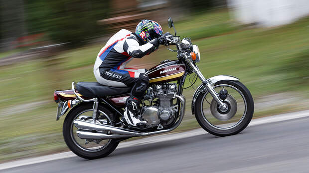 Vom entspannten Dahinrollen bis zum zügigen Cruisen reicht das Portfolio der Kawasaki 900 Z1 in diesem Drehzahlbereich. Betreibt man aktive Ahnenforschung und gibt ihr mal die Sporen – sprich, dreht man die Gänge einmal bis an den roten Bereich heran –, wird es nicht etwa furchteinflößend, sondern spaßig-dynamisch. Zumindest so lange, wie keine Wechselkurven mit schlechtem Straßenbelag daherkommen. Dann nämlich zeigt die Zett schon ein wenig von dem, was sie zu diesem gefürchteten Motorrad gemacht hat. Wir drehen den Hahn also wieder etwas zu und werden uns bewusst, dass die Dame unter uns fast 40 Jahre alt ist. Und dass uns die Fahrer von damals um die heutigen, viel besseren Reifen tierisch beneidet hätten.