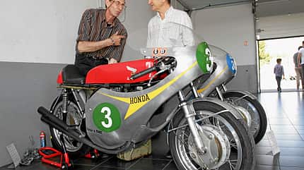 Motorengedröhn rauscht über den Circuit Paul Ricard in Le Castellet. Es ist Sunday Ride Classic, Bikers Classics auf Französisch: nur bunter, voller, frecher und frivoler als die Veranstaltung in Belgien. Ex-Champions stehen zum Gruppenfoto vereint: „König Ago“ (so heißt Multi-Weltmeister Giacomo Agostini im Programmheft), Jim Redman, Freddie Spencer, Steve Baker und Lokalmatador Christian Sarron. Daneben parkt in einer Box des Fahrerlagers vermeintlich Agos MV-Dreizylinder neben einer Honda RC. Ein schlanker Herr tritt herbei, turnt fast schlaksig zwischen vier Motorrädern herum. „Das sind eigentlich keine Repliken“, sagt er mit freundlich-fröhlichem Tonfall, „dies ist meine ganz persönliche Hommage an klassische Rennmaschinen von Honda und MV Agusta!“