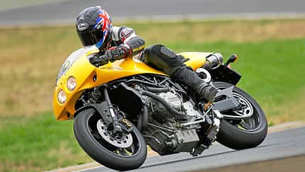 Ian bittet zu einer ausführlichen Kostprobe. Er scheint sich sicher zu sein, was vom Fahrer nicht behauptet werden kann. Schließlich dreht dieser gleich die allererste Runde überhaupt mit dem V8-Superbike. Weder Drysdale noch der bereits feststehende Käufer des Einzelstücks im Wert von zirka 66.000 Euro sind bisher je einen Meter mit der Maschine gefahren. Glücklicherweise sieht das Bike alles andere als furchteinflößend oder unbeherrschbar aus, auch wenn man ahnt, dass die Sitzposition einen langen, dehnungsfähigen Oberkörper verlangt. 150 PS Spitzenleistung bei 12.200 Umdrehungen bringen einen erfahrenen Tester heutzutage ebenfalls nicht ins Schwitzen. Normalerweise zumindest. Denn die Vorstellung, acht Zylindern auf zwei Rädern die Sporen zu geben, hat schon etwas Besonderes. Dass die Probefahrt auf der Rennstrecke stattfindet: alles andere als beruhigend.