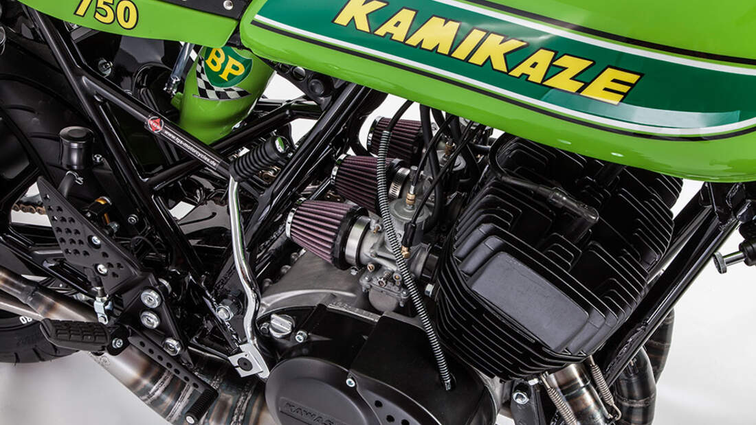Motor: Kawasaki 750 H2, komplett neu aufgebaut mit 800 cm³, geänderte Steuerzeiten, Jolly-Moto-Auspuff, 34er-Mikuni-Vergaser