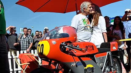 Letztes Jahr hatte Ines Kringler im Rahmen der Tübinger Retromotor die Gelegenheit, ihrem Idol Giacomo Agostini die ihm zu Ehren gebaute MV Agusta-Renn-Replika zu präsentieren. Den 9. September 2012 wird die jüngste MV Agusta-Pilotin Deutschlands nicht mehr vergessen: Quasi als nachträgliches Geburtstagsgeschenk zu Agos 70sten zog sie zusammen mit dem 15-fachen Weltmeister das Tuch von ihrer 125er-MV. Der Ex-Champ war sichtlich angetan vom gelungenen Umbau und dem Enthusiasmus der Erbauer. Spontan bedankte sich der Charmeur mit einem Autogramm und einem Küsschen bei Ines.