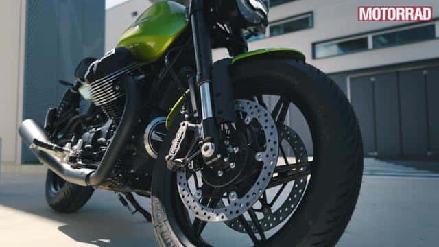Dass sie es sportlich meint, beweist die Moto Guzzi V7 Sport eher mit der neuen Upside-down-Gabel und der Doppelscheibenbremse am Vorderrad. Die 41er Forke führt das 18-Zoll-Vorderrad mit schmalem 100er-Reifen. Hinten federn und dämpfen zwei Federbeine das 17-Zoll-Hinterrad in 150er-Breite. Die Leichtmetallfelgen sind laut Moto Guzzi insgesamt um etwa 1,8 kg leichter als bei der V7 Stone (minus 934 g vorn und 834 g hinten). Das soll sich vor allem mit verbessertem Handling bemerkbar machen.