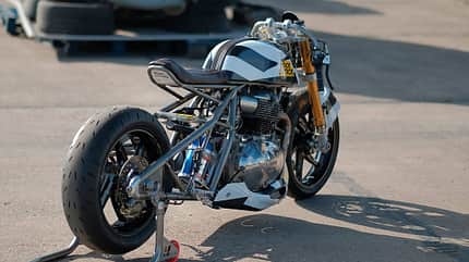 Das 3,5 x 17 Zoll große PVM-Vorderrad wird von einer Öhlins-Upside-Down-Gabel geführt, die für den Einsatz auf dem Dragstrip nur über einen minimalen Federweg verfügt. Hinten deht sich eine PVM-Felge in der Dimension 5,25 x 17 Zoll. Die wenig profilierten Reifen steuert Shinko bei. Bremspower liefert vorne eine 320er-Einscheibenanlage von Brembo mit radial verschraubtem Vierkolben-Sattel. Hinten setzt die Lock Stock ebenfalls auf Bembo-Komponenten. Für den 1/8-Meilen-Sprint ist die Royal Enfield Lock Stock vorne mit einem 17er Ritzel und hinten mit einem 40er Kettenrad bestückt.