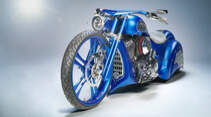 Die Indian Chief Vintage ist kaum noch wieder zu erkennen. Der Motor und einige Applikationen identifizieren die Basis des Top Mountain Baggers als Indian. Zum Glück hat der gelernte Kfz-Mechaniker Markus Krasser den Markennamen auf dem Motorrad verwendet. Gebaut wurde das Motorrad für Attila Schreiber, den Besitzer des Top Mountain Motorcycle Museum im Ötztal (Österreich). Besonders die Lackierung, die vom österreichischem Unternehmen Airvolution stammt, enthält viele Details des Museums.