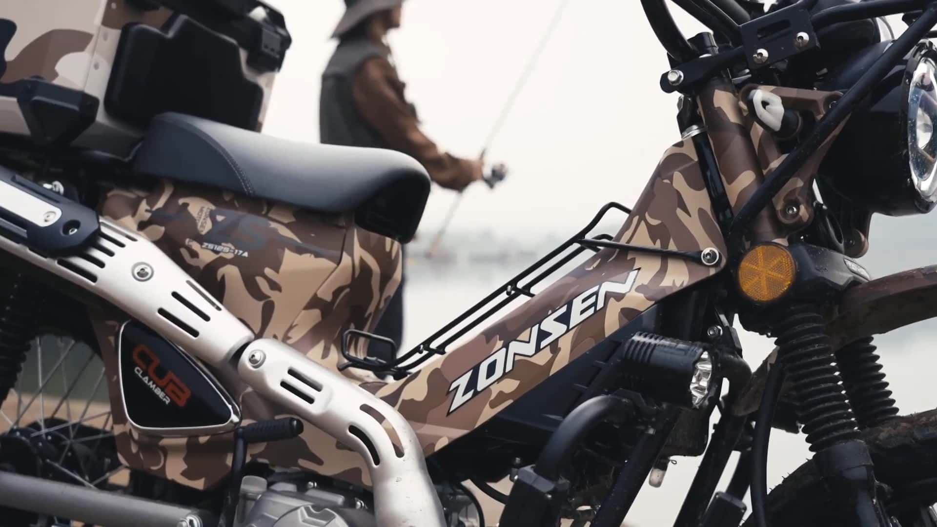 Selbstverständlich gibt es inzwischen auch chinesische Adventure Cubs. Besonders nah am originalen Honda-Konzept ist die Interpretation dieses Themas von Piaggio-Partner Zongshen: die Zonsen Yemi, erstmals vorgestellt im Jahr 2023. Sie ist ihrem Vorbild, der Honda CT 125 Hunter Cub, sehr ähnlich, insbesondere mit dem identisch wirkenden roten Lack. Doch inzwischen gibt es die Yemi in einigen weiteren Farbvarianten – und sogar eine Camouflage-Ausführung mit Tarnmuster-Dekor. Zusatzbezeichnung der Zonsen Yemi: Cub Clamber, was aus dem Englischen übersetzt sinngemäß "kletterndes Jungtier" bedeutet.