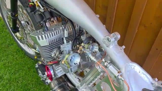 Diesen luftgekühlten Zweitakt-Dreizylinder hat Florian Hauser aus 3 einzelnen Hilfsmotoren des Typs Avenger 85 zusammengesetzt. Dreimal 85 Kubik ergeben 255 Kubik – und circa 25 PS bei 12.000/min. Mit der selbstgebauten Kurbelwelle zünden die Zylinder in der Reihenfolge 1-3-2, nach Vorbild der legendären Kawasaki H2 750, hier allerdings gegenläufig rotierend. Dazu passt die adaptierte Racing-Zündung, die für den Kawasaki-Klassiker vorgesehen war.