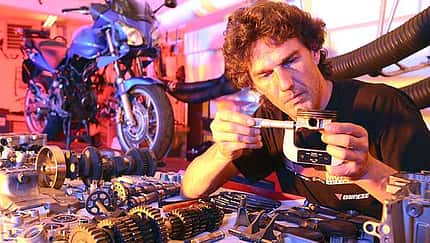 Honda-Männer Bescher und Heiland begutachten die CBF-Teile.