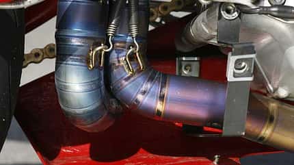 Der Aufwand, den Mayerhofer hierfür betreibt, ist allerdings gewaltig. Pistal-Kolben mit 100 Millimeter Durchmesser bringen den Hubraum auf 1123 cm3. Die Einlasskanäle verwandelt Mayerhofer mittels aufwendiger Schweiß- und Fräsarbeiten in Fallkanäle und überarbeitet anschließend Brennräume und Ventilsitze. Schärfere Nockenwellen und eine höhere Verdichtung gehören zu den flankierenden Maßnahmen. Und selbstverständlich muss auch der Motor seinen Teil zur Pfundskur beitragen. Er tut dies mit leichteren Carillo-Pleulen, einer erleichterten und feingewuchteten Kurbelwelle und dem leichten Getriebe der 1098 samt Übertragungselemente für Primärtrieb, Ölpumpe, Anlasser und einem leichteren Rotor. Gefüttert wird der Desmodue von einer 748er-Einspritzanlage, die durch eine vergrößerte Airbox einatmet.