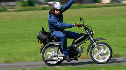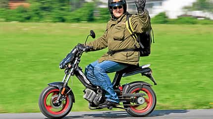 Wer damals zweitakt- statt zweibeinbetrieben beim Baggersee oder Freibad auftauchte, galt was. Haarbürste in der Jeansjacke, Fuchsschwanz am Lenker, die Füße hoch auf dem Rahmen abgestellt – trotz Flaumbart und Akne-Landschaft im Gesicht fühlte man sich wie der Chef. Dass man mit 25 Sachen von jedem Hobbyradler abgehängt wurde, konnte man natürlich nicht so stehen lassen, also ging es ran an Zylinder, Ritzel oder Auspuff. Wohl jeder kannte einen, der einen kannte, dessen Bruder „sein Kumpel" wiederum von einem Frisier-Magier aus dem Nachbardorf gehört hatte, „dem sein Mofa 120 läuft". Und es gab auch die Wahnsinnigen, die auf ihren Mofas die abenteuerlichsten Touren, zum Teil sogar ins Ausland unternahmen.