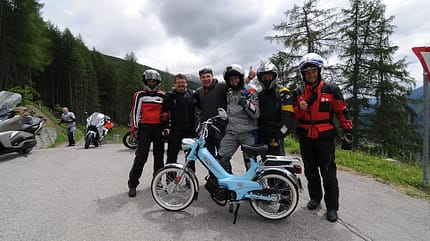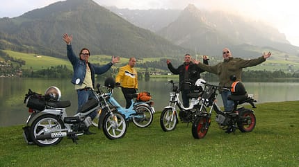In den 1970ern und 1980ern haben die possierlichen Motor-Fahrräder ganze Jugendgenerationen mobilisiert, so auch die Beteiligten an diesem Alpen-Cross: Herder begann seine Karriere als Motorist 1977 auf einem Jawa-Mofa aus dem Quelle-Katalog, Froberg stattete auf einer blau-silbernen Zündapp ZD 20 Ende der 70er seiner lieben, aber 30 Kilometer entfernt lebenden Großmama regelmäßige Besuche ab; das waren seine ersten autarken Reisen. Lohse (Jahrgang 1969) war als Emsländer stolz auf seine anthrazitfarbene Hercules Prima 5 mit weißen Felgen (Jahrgang 1984), die bei (Dauer-)Gegenwind immerhin noch 28 fuhr. Und Dentges hatte als elfjähriger Verkehrsdelinquent während der Bauernhofferien in Bayern 1982 erstmals eine längere Liaison mit einer Piaggio Ciao, die er für ausgedehntere Landausflüge außerhalb des Polizeiradars nutzte.