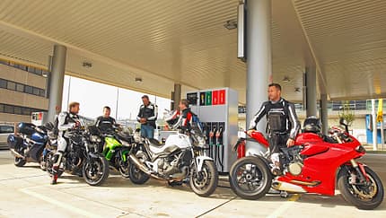 Bei der sich anschließenden flotten Landstraßenrunde wacht die zum Teil etwas ermüdete Testmannschaft wieder auf. Mit kräftigen Zwischenspurts und härteren Bremsmanövern steigern sich der Fahrspaß und die Dynamik immens. Kawasaki, Triumph und Ducati leben hier richtig auf, während die Honda mit ihren 48 PS schon nah an ihr Leistungslimit kommt. Auf die Platzierung in der Verbrauchsliste hat das allerdings keinen Einfluss. Der Mehrverbrauch liegt zwischen 0,9 und 1,7 Litern, die Laune der Fahrer steigt aber mindestens um das Dreifache. Dass man mit einer verbrauchsoptimierten Fahrweise bei jedem der Motorräder rund 25 Prozent Treibstoff im Vergleich zum flotten Fahren einsparen kann, ist mehr, als manch einer vermutet hatte. Und wenn man es mal eilig hat? Dann sollte man genügend Zeit zum Tanken einkalkulieren! Denn was sich nach unten mühsam sparen lässt, kann unter Volllast locker innerhalb kürzester Zeit wieder rausgefeuert werden. Aber wie viel genau?