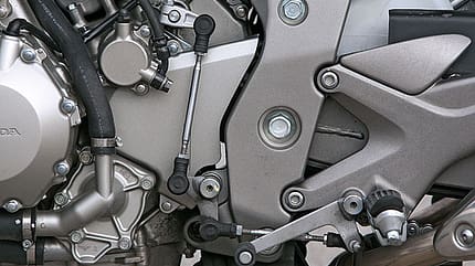 Der neben Design und Rahmenwerkstoff größte Unterschied der Schwestern ist von außen nicht zu sehen, im Fahrbetrieb jedoch sehr wohl spürbar: die Änderungen am Motor, dem aus der 2006er-Fireblade stammenden Vierzylinder. Er bekam den Zylinderkopf des Naked Bikes CB 1000 R. Und weil die CBF-Kundschaft eher selten mit der Stoppuhr unterwegs ist, wurden die ursprünglichen 125 PS zugunsten von mehr Druck in der Drehzahlmitte durch zahmere Steuerzeiten auf 107 PS zurückgenommen (eine 98-PS-Version gibt es auf Wunsch). Mit durchschlagendem Erfolg. Spürbar kräftiger zieht der Vierer an der Kette. Inwiefern die neue, komplett aus Edelstahl gefertigte Vier-in-eins-Auspuffanlage zu dieser Charakteristik beiträgt, bleibt unklar. Netter anzusehen als die beiden schlanken Endschalldämpfer der Vorgängerin ist das recht klobige Teil jedenfalls nicht. Kleines Schmankerl an Rande: Damit die CB-Doppel-F nicht aus dem Ruder läuft, haben die Honda-Ingenieure auf der linken Fahrzeugseite hinter der Fußraste ein Gegengewicht platziert, um das Gewicht des einseitigen Schalldämpfers auszubalancieren.