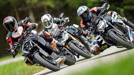 Als Einzige dieses Vergleichs entstammt die KTM 1390 Super Duke R Evo einer eigenen Entwicklungslinie; weder Motor noch Fahrwerk sind von einem Supersportler abgeleitet wie bei BMW und Ducati. Bei einem kürzlich auf der Rennstrecke ausgefahrenen Vergleich sahen die schnellen Kollegen von PS (PS 7/2024) dies als Hauptgrund dafür, dass keiner von ihnen mit der KTM die Rundenzeiten von BMW und der Ducati Streetfighter V4 S erreichte. Es fehle ein wenig an Lenkpräzision und Rückmeldung, so ihr Eindruck.