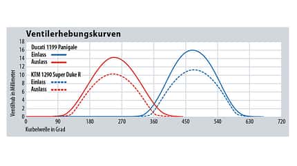 Welch ein Unterschied. Nicht nur bei den Ventilgrößen hat die Ducati mit 46,8 mm (Einlass) und 38,2 mm (Auslass) die Nase vorn (KTM: 42/34 mm). Sie stößt ihre Einlassventile gigantische 16 mm weit auf (KTM: 11,5 mm). Das verschafft der Ducati fast 70 Prozent mehr freien Ventilquerschnitt, um Frischgas einzusaugen. Der Preis, den man für solch scharfe Steuerzeiten zahlt, besteht unter anderem aus viel Ventilüberschneidung, unruhigerem Leerlauf und Leistungsnachteilen bei niedrigen Drehzahlen.
