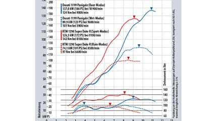 Aus kleinerem Hubraum holt die Ducati mehr Spitzenleistung. Das geht in erster Linie über mehr Drehzahl und eine scharfe Motorabstimmung, die bei niedrigen Drehzahlen Einbußen mit sich bringt. Ab 7000/min geht die Post ab. Für ihren Einsatzzweck, die Rennstrecke, geht das durchaus in Ordnung. Die KTM 1290 Super Duke R schaufelt dagegen bereits ab Standgas massenhaft Drehmoment ans Hinterrad. Selbst die Drehmomentkurve des Regen-Modus kann sich noch sehen lassen.