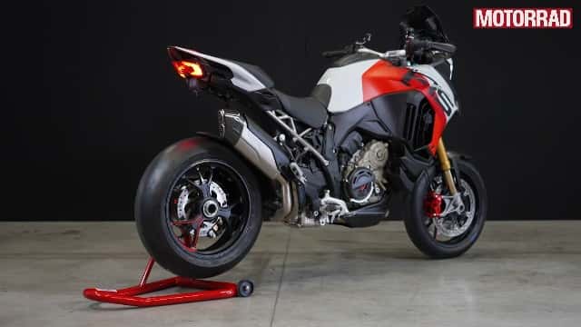 Für den Einsatzzweck einer Multistrada, so der Projektverantwortliche, sei der Supersport-Motor noch mal neu abgestimmt worden. Damit würde der Antrieb bei normaler Fahrt auf der Landstraße im unteren Drehzahlbereich gutmütiger zu Werke gehen als aus der V4-Streetfighter bekannt, aber bei hohen Drehzahlen entsprechend zornig loslegen, wie es sonst keine Multistrada hinbrächte. Ohne den Rennauspuff serviert der Motor mit der Akrapovic-Serienanlage mit Euro-5+-Zulassung dazu 180 PS bei 12.250/min. Das ist mal eine Ansage und ein ausgestreckter Mittelfinger auf die Vernunftfrage, ob ein Reisebike so etwas braucht.