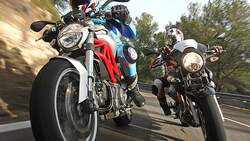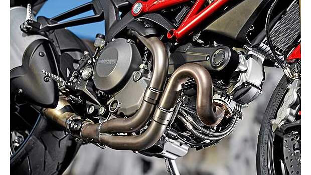 Wirklich neu ist dagegen die von den Superbikes abgeleitete vierstufige Traktionskontrolle, wie das abschaltbare ABS ab Werk dabei. Und die Auspuffanlage, die mit dem kühnen Schwung ihrer Krümmer den optischen Brückenschlag zu Streetfighter und Diavel schafft. Sie spart noch einmal ein halbes Kilogramm an Gewicht und sorgt zusammen mit der größeren Airbox für stramme 95 PS in den Papieren. Und für einen klasse Sound. Den Druck auf den Anlasser beantwortet die Monster mit sattem, zufriedenem Brabbeln. Das basst.Entspannt und mit deutlich weniger Druck auf den Handgelenken lässt sie sich am höheren Lenker durch das chaotische Treiben auf den vernarbten Straßen Catanias dirigieren. Die Gabel verarbeitet die Flicken erstaunlich sensibel, mehr Härte lässt das direkt angelenkte Federbein walten.