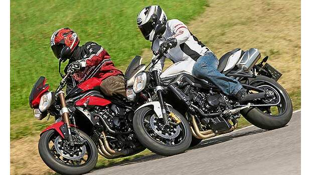 Runter von der Autobahn, hinein ins Kurvendickicht. Bereits beim ersten heftigen Anbremsen spürt man einen Unterschied. Für Fahrer, die einen extrem sportlichen Stil mit spätestmöglichen, heftigen Bremsmanövern vor Kurven bevorzugen, ist die Speed Triple besser gerüstet. Die in der 1050er verbauten, radial verschraubten Brembo-Vierkolben-Festsättel liefern trotz ABS einen knackigeren Druckpunkt und überzeugen mit mehr Biss als die Nissin-Stopper gleicher Bauweise an der 675er. Das allein macht den Unterschied jedoch nicht aus, denn spät und effektiv kann man die Street Triple R auch verzögern. Nein, das Fahrwerk der großen Triple ist stabiler, steifer. Bei Gewaltbremsungen bleibt beispielsweise die Front der Speedy stabiler, denn ihre Gabel ist straffer abgestimmt und die Gabelklemmung mordsmassiv. Im direkten Vergleich kommt einem die Fahrwerksauslegung der sportlichen 675 R-Variante beinahe touristisch vor, obwohl auch diese bedingt rennstreckentauglich ausgelegt ist. Zwar weisen beide Modelle mit 120 Millimetern vorn und 130 hinten denselben Federweg auf, doch die Federelemente der 675er sprechen feinfühliger an und sind nicht ganz so straff abgestimmt wie die ihrer Zwillingsschwester. Hinein in die Kurve, abducken, aufrichten, durchladen, erneut bremsen, abwinkeln. Wer zu diesem Tanz einen Partner sucht, der die Bewegungen fast wie von selbst macht, findet ihn in der Street Triple. Das geringere Eigengewicht und die kleinere Rotationsmasse des Motors geben ihr die Trumpfkarte in die Hand: Die 675er lässt sich leichter abwinkeln und ist handlicher als die 1050er. Beide bleiben selbst in schnell gefahrenen Kurven stabil und sind ideallinientreu. Wer gern Wheelies fährt oder fahren lernen möchte, findet in der kleineren Street Tiple ebenfalls den besseren Trainingspartner - auch das gelingt mit ihr müheloser.