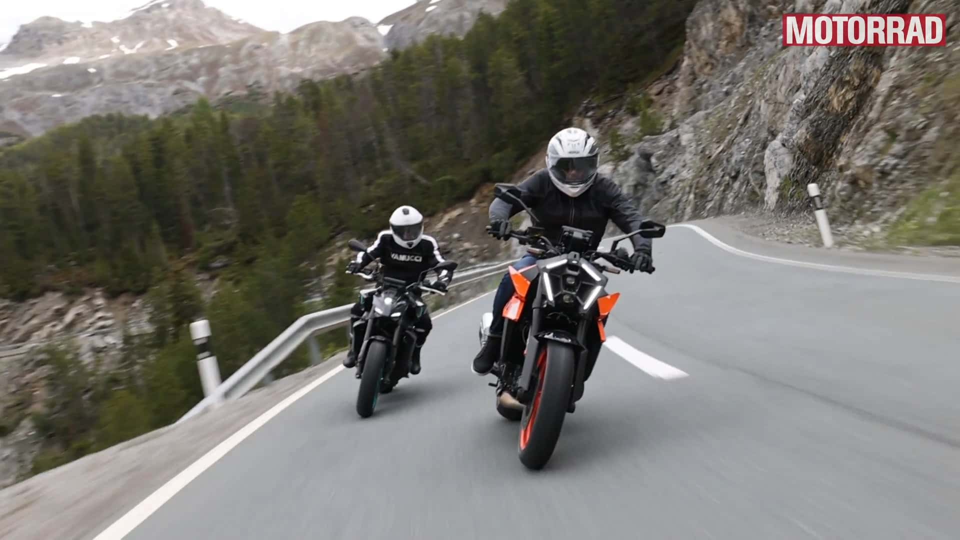 Erst wer dem ständigen Drang der KTM 990 Duke nachgibt und das Tempo erhöht, kann sich am quasi nicht vorhandenen Aufstellmoment beim Bremsen erfreuen und die Vorzüge der stabilen Kurvenlage auskosten. Und der beeindruckenden Fahrleistungen. Und der sehr gut applizierten Fahrassistenten. Dank dieser Qualitäten sichert sich die KTM dann auch mit komfortablem Abstand den Testsieg in den Alpen. Die ausgewogene und sehr zugängliche Yamaha MT-09 wird auf Rang 2 verwiesen. Wir freuen uns schon auf die angekündigte SP-Version, die die erwähnten Defizite womöglich ausmerzen kann.