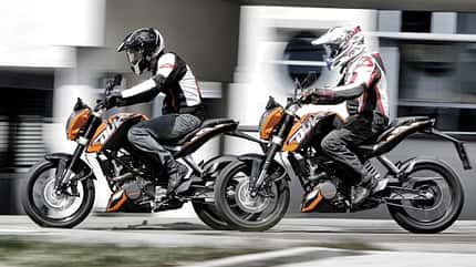 KTM 125 Duke KTM 200 Duke Bauart Einzylinder- Viertaktmotor Einzylinder- Viertaktmotor Einspritzung Ø 33 mm Ø 35 mm Kupplung Mehrscheiben- Ölbadkupplung Mehrscheiben- Ölbadkupplung Bohrung x Hub 58,0 x 47,2 mm 72,0 x 49,0 mm Hubraum 125 cm3 200 cm3 Verdichtung 12,6:1 11,5:1 Leistung 11,3 kW (15 PS) bei 10500/min 19,0 kW (26 PS) bei 10000/min Drehmoment12 Nm bei 8000/min20 Nm bei 8000/min