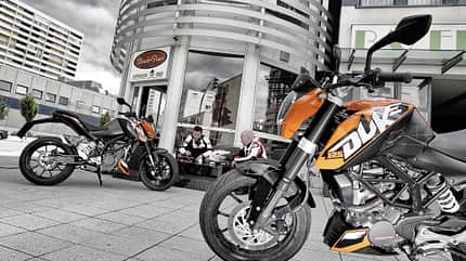 So einen Schritt überlegt man sich mit der 125er zweimal, denn für den Überholvorgang muss reichlich Strecke einkalkuliert werden. Aber gerade die geringe Leistung animiert dazu, ständig den Schwung mitzunehmen und stets auf der Ideallinie zu bleiben – ein legaler, höllischer Spaß. Abbiegen auf die Schlechtwegstrecke: Die Gabeln sind angeblich identisch, die Stoßdämpfer geringfügig unterschiedlich abgestimmt. Sänftenmäßiges Gleiten darf man bei beiden Dukes nicht erwarten, schließlich ist die Fahrwerksabstimmung sportlich straff. Bemängelnswert ist das Ansprechverhalten der 200er-Gabel, die beim Testexemplar hohe Losbrechkraft aufwies und sehr unsensibel ansprach. Am Schluss bleibt die Frage, wer die für den asiatischen Markt konzipierte 200er in Europa kaufen wird. Klar ist: Bereits die kleine Schwester ist nicht nur in Asien beliebt, sondern auch in Deutschland ein Hit. Von Januar bis Juli 2012 wurden 1084 Exemplare zugelassen – Platz eins der 125er-Zulassungsstatistik. Aber auch die 200er wird wohl ihre Fangemeinde finden.