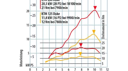 Will man mit der 125er zügig beschleunigen, sollte man bei mindestens 7000/min einkuppeln. Bei der 200er reichen 5000/min. Beide Motoren haben einen Gummiband-Charakter, gefühlsmäßig kann man sie endlos drehen. Und trotz der geringfügig längeren Sekundärübersetzung der 200er muss bei beiden Modellen bis in den fünften Gang geschaltet werden, damit die 100-km/h-Marke auf dem Tacho erscheint. Auf der anderen Seite kann die 200er überraschend schaltfaul gefahren werden. Man ertappt sich sogar in der Stadt dabei, im sechsten Gang mitzuschwimmen. Da ruckelt nichts. Kein Kettenpeitschen, kein Motorstottern. Doch um richtig loszulegen, muss man die Motoren drehen, beide Singles produzieren ihre Höchstleistung, erst kurz bevor der Begrenzer eingreift. Der unbestechliche MOTORRAD-Prüfstand attestiert der 200er später ansehnliche 28 PS bei 10 100/min und ihrer kleinen 125er-Schwester immerhin 16 PS bei 9900 Touren. Somit hat die 200er-Duke 57 Prozent Mehrleistung bei fast identischem Gewicht. Das spiegelt sich natürlich in den Fahrleistungen wider: Die 200er beschleunigt von 0 auf 100 km/h in 9,0 Sekunden, die 125er braucht dafür 17,9 Sekunden. Das sind Welten.