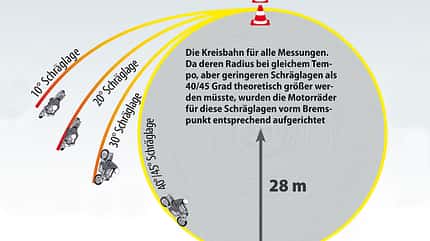 Da selbst Top-Tester Karsten Schwers nicht gnadenlos an der Bremse zieht, wenn er die Reaktion nicht kennt, wurde die Schräglage bei den Bremsmessungen sukzessive gesteigert. Eine Schreckbremsung bei Geradeausfahrt diente als Referenzwert. Als Ausgangsgeschwindigkeit wurde für jeden Bremsvorgang 60 km/h festgelegt, also in etwa das Tempo, das beim Durchwedeln enger Landstraßenkurven häufig vorkommt. Um die passende Schräglage, die über einen Schräglagensensor, und die Zielgeschwindigkeit, die durch den unterschiedlichen Abrollumfang der Reifen in Kurvenfahrt stark variiert und daher durch einen GPS-Sensor erfasst wurde, immer möglichst genau zu treffen, durchliefen alle Teilnehmer eine Kreisbahn mit einem Radius von 28 Metern. Auf dieser tastete sich Tester Schwers an die geforderten Werte heran. Wie der Aufbau des Parcours aussah und wie die Messungen erfolgten, steht im Detail auf Seite 6 "Der Messaufbau".