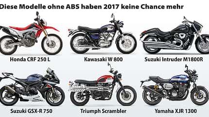 Und das ist gut so. Der Grund: Nur solche Wettbewerbsmaschinen sind vom ABS- oder CBS-Zwang befreit, ansonsten wird es Ende 2016 eng für einige Hersteller. Und davon sind nicht nur Exoten wie Benelli, Boss Hoss, Mash oder Royal Enfield betroffen, sondern auch eine Reihe etablierter Marken und Modelle: Es gibt kein ABS für einige Sportler und Cruiser. Beispielsweise aber auch nicht für die kleine Enduro CRF 250 L von Honda, für das schicke Retromodell Kawasaki W 800 – und es fehlt auch bei Suzukis Supersport-Ikone GSX-R 750. Gleiches gilt ebenfalls für die Yamaha XJR 1300. Kaum zu glauben – wurde der luftgekühlte Big Block doch erst für dieses Modelljahr völlig überarbeitet.