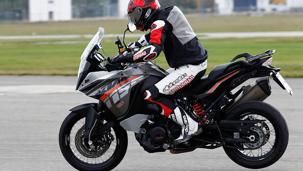 Genug des Vorgeplänkels jetzt, die KTM 1190 Adventure mit Kurven-ABS scharrt mit den Hufen. Geradeaus erreicht sie mit einem Bremsweg von 15,4 Metern aus 60 km/h keinen Topwert. Was auffällt: Greift der Tester voll zur Bremse, entsteht im ersten Moment Schlupf. Bedingt durch den langen Gabel-Federweg ist die Last auf dem Vorderreifen anfangs niedriger.