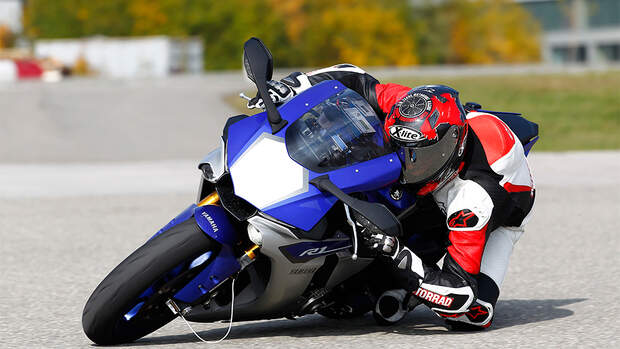 Erst wenn die Ellbogen fast über den Asphalt schleifen, die Yamaha YZF-R1 mit 45 Grad Schräglage ums Eck pfeffert, verhält sie sich bei einer Schreckbremsung leicht kritisch. Dann entsteht im ersten Moment viel Schlupf am Vorderrad. Die Yamaha fängt sich mit der durch die Verzögerung abnehmenden Schräglage aber schnell wieder und kommt beherrschbar zum Stehen.