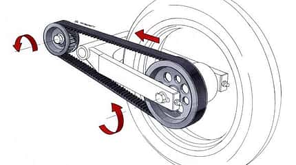 Die Alternative zum Kettenantrieb: identisches Prinzip, nur mit anderen Werkstoffen. Vorteil gegenüber der Kette ist der geringe Wartungsaufwand