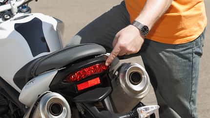Zur Kontrolle der Bremsen gehört der Blick aufs Bremslicht: Motorrad auf den Ständer stellen, Zündung an, selbst rechts neben dem Motorrad stehen. Die rechte Hand greift zum Bremshebel, der rechte Fuß tritt aufs Pedal. Falls das Bremslicht aus dieser Position nicht zu sehen ist, kann die linke Hand als Reflektor dienen.