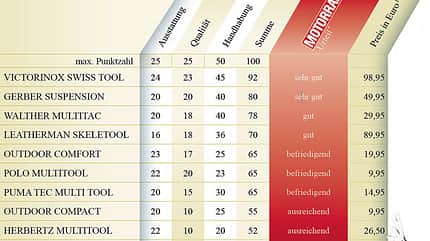 Teuer gleich gut? Das stimmt in diesem Test nur bedingt. Klar ist: Das teuerste Multitool hat in der Abschlusstabelle eindeutig die Nase vorn. Der hohe Anschaffungspreis muss aber relativiert werden, denn bei guter Pflege wird das Swiss Tool auch noch in der nächsten Generation einen guten Job machen. In Sachen Preis-Leistung zeigt das Gerber Suspension zu einem überaus fairen Tarif sehr gute Eigenschaften. Und das Multitac von Walther ist besonders für Outdoorfans interessant, die beim Multitool Wert auf eine kräftige Klinge legen.