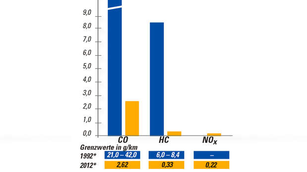 Die blauen Balken stellen die 1992 geltenden Abgasgrenzwerte für Motorräder wie der CBR 900 RR dar. Die gelben entsprechen der seit 2006 herrschenden, EURO III genannten Regulierung. Die heute geltenen Grenzwerte stellen einem die hohen Anforderungen an eine moderne Einspritzung inklusive Abgasreinigung bildlich dar. Dass auch das Abgas einer CBR 1000 RR immer noch giftig ist, liegt in der Natur des Verbrennungsmotors.