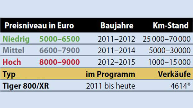 Schnäppchenjäger suchen gezielt nach frühen, ABS-losen Triumph Tiger 800 mit hoher Kilometerleistung. Die sind schon für unter 5000 Euro zu bekommen. Das Gros des Angebots bewegt sich zwischen 7000 und 8000 Euro. Die Bandbreite ist groß: Vom Ersthand-Schätzchen mit unter 5000 Kilometern bis zum Kilometerkönig mit Vollausstattung ist alles dabei. Fahrwerks-Optimierungen und Gepäcksysteme werden honoriert, rechtfertigen aber keine Mondpreis-Aufschläge. Händler mögen die Tiger, sie wird gern in Zahlung genommen. 9000 Euro sind die absolute Gebrauchtpreis-Schmerzgrenze, denn darüber gibt‘s bereits neuwertige Vorführer.
