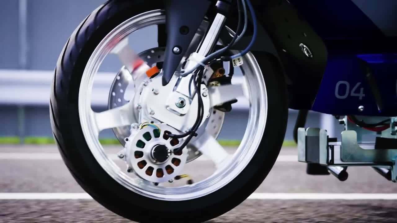 Versuchsträger und erfolgreiches Demonstrationsfahrzeug für das AMSAS ist ein ebenfalls neu entwickeltes Elektro-Motorrad. Offenbar basiert es auf der sportlichen Yamaha R25, eng verwandt mit der hierzulande bekannten R3. Deren Vollverkleidung lässt – wohl absichtlich – nicht alle dahinter versteckten Details erkennen. Unten an den Verkleidungsseiten ist der Schriftzug 04 zu lesen. Ausgehend von der R25 oder der R3 sind vom elektrischen Antrieb der Yamaha 04 ähnliche Leistungsdaten zu erwarten. Für den Reihenzweizylindermotor der R3 werden 321 Kubik und 42 PS genannt. Allerdings wurde zur Vorführung des AMSAS demonstrativ die Endantriebskette entfernt. Die Botschaft: Es soll hierbei zunächst nur um das AMSAS gehen, und für dessen Auftritt bis Schrittgeschwindigkeit genügte der Elektromotor am Vorderrad. Weitere Details zur 04 nannte Yamaha noch nicht.