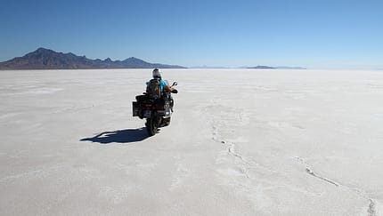 „Etwa zwei Stunden brauchst du bis dahin“, sagt der Mitarbeiter des Campingplatzes, als ich ihn frage, wie lange ich zum Bonneville Salzsee brauche. Ich habe eher zufällig auf der Karte gesehen, dass er gar nicht so weit von Salt Lake City bzw. Provo entfernt liegt. Schon 6.30 Uhr sitze ich auf dem Motorrad, heute geht es schnell, denn ich muss nichts abbauen – ich bleibe noch eine weitere Nacht hier. Um diese Zeit ist es noch angenehm kühl, ich will möglichst vor der Mittagshitze wieder vom Salzsee verschwunden sein. Schon eine Stunde später zeigt das Thermometer 25 Grad, dann 28.
