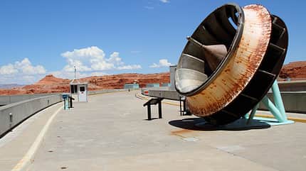 Die Tour ist zu Ende, der Tag noch jung. Auf dem Weg zurück halte ich am Glen Canyon (nicht Grand Canyon) Damm, um mir das Besucherzentrum anzusehen – außerdem gibt es dort eine Klimaanlage. Sie zeigen, wie der Damm gebaut wurde, wie viel Energie die Turbinen erzeugen und was es sonst noch über den Damm zu wissen gibt. Eine geführte Tour zur Dammkrone, hinein ins Innere und zur Turbinenhalle kostet nur fünf Dollar. Gekauft! Allerding muss ich fast eine Stunde bis zur nächsten Tour warten.